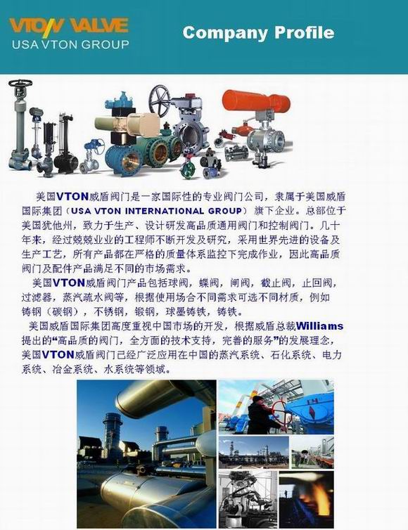 美國威盾國際集團高度重視中國市場的開發(fā),根據(jù)威盾總裁Williams提出的“高品質的閥門,全方面的技術支持,完善的服務”的發(fā)展理念,美國VTON威盾閥門已經廣泛應用在中國的蒸汽系統(tǒng)、石化系統(tǒng)、電力系統(tǒng)、冶金系統(tǒng)、水系統(tǒng)等領域。 |